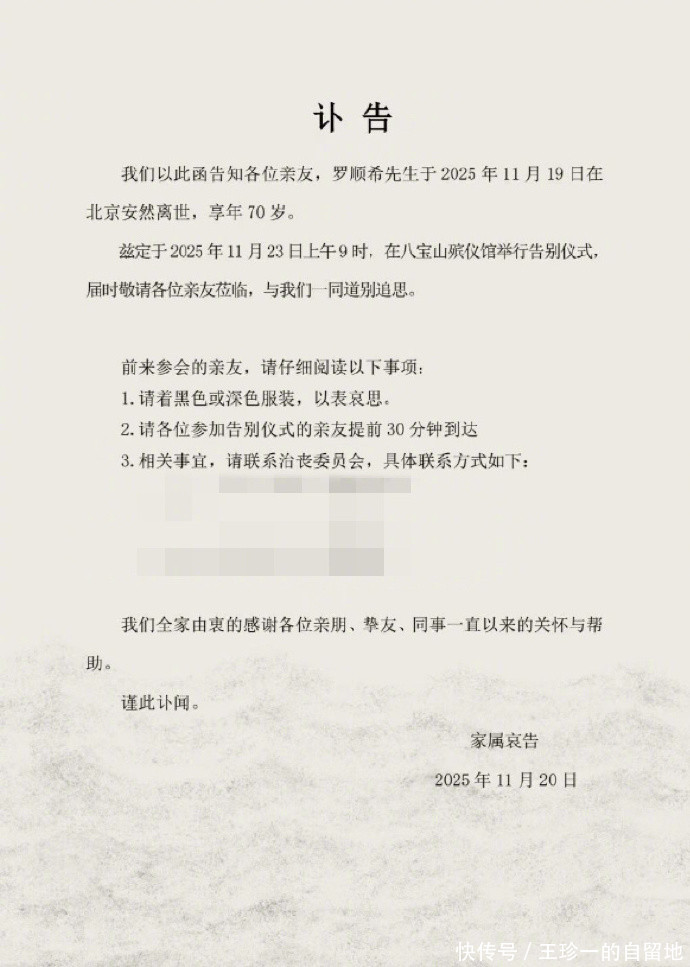 根据讣告可知,罗晋父亲在北京离世,享年70岁,将于11月23日在八宝山殡仪馆举行告别仪式。