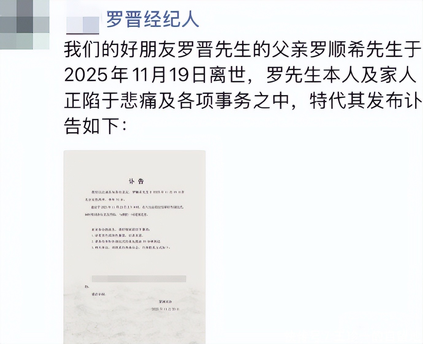 罗晋的经纪人说罗晋的父亲罗顺希于2025年11月19日离世,罗晋和家人正陷于悲痛和各项事务中,因此他代罗晋发布有关罗顺希的讣告。
